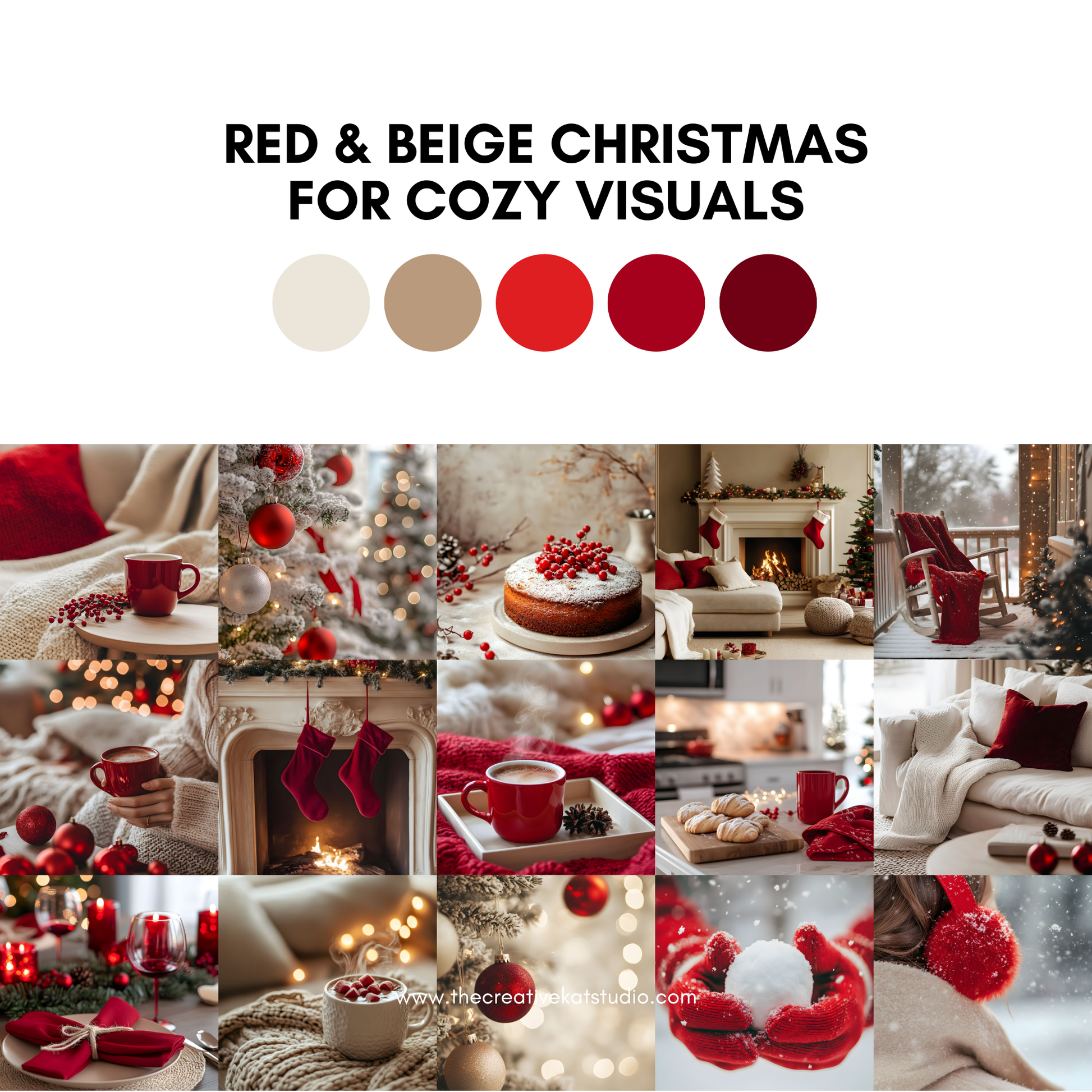 A curated mix of classic décor, cozy textures, wrapped gifts, holiday baking, and twinkling lights—all styled in rich crimson, creamy beige, and soft golden tones for a festive yet refined look.